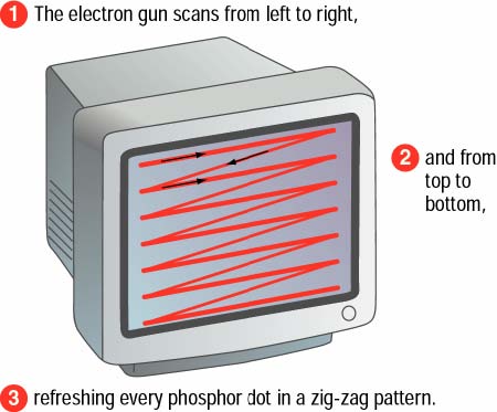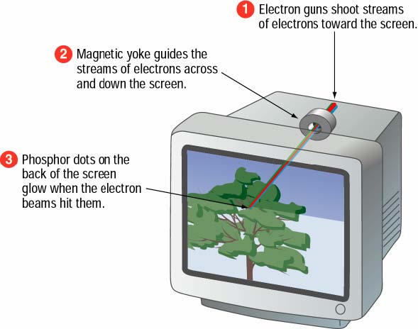 Ο έγχρωμος καταγραφέας CRT χρησιμοποιεί τρία ανεξάρτητα μεταξύ τους «πυροβόλα» ηλεκτρονίων (θερμαινόμενες κάθοδοι), συγχρονισμένα έτσι ώστε οι τρεις δέσμες να φτάνουν ταυτόχρονα (αλλά καθεμία με τη δική της ένταση) σε μικρή περιοχή της οθόνης φωσφόρου, η οποία περιέχει ομάδα κουκίδων κόκκινης – πράσινης - κυανής χρωστικής